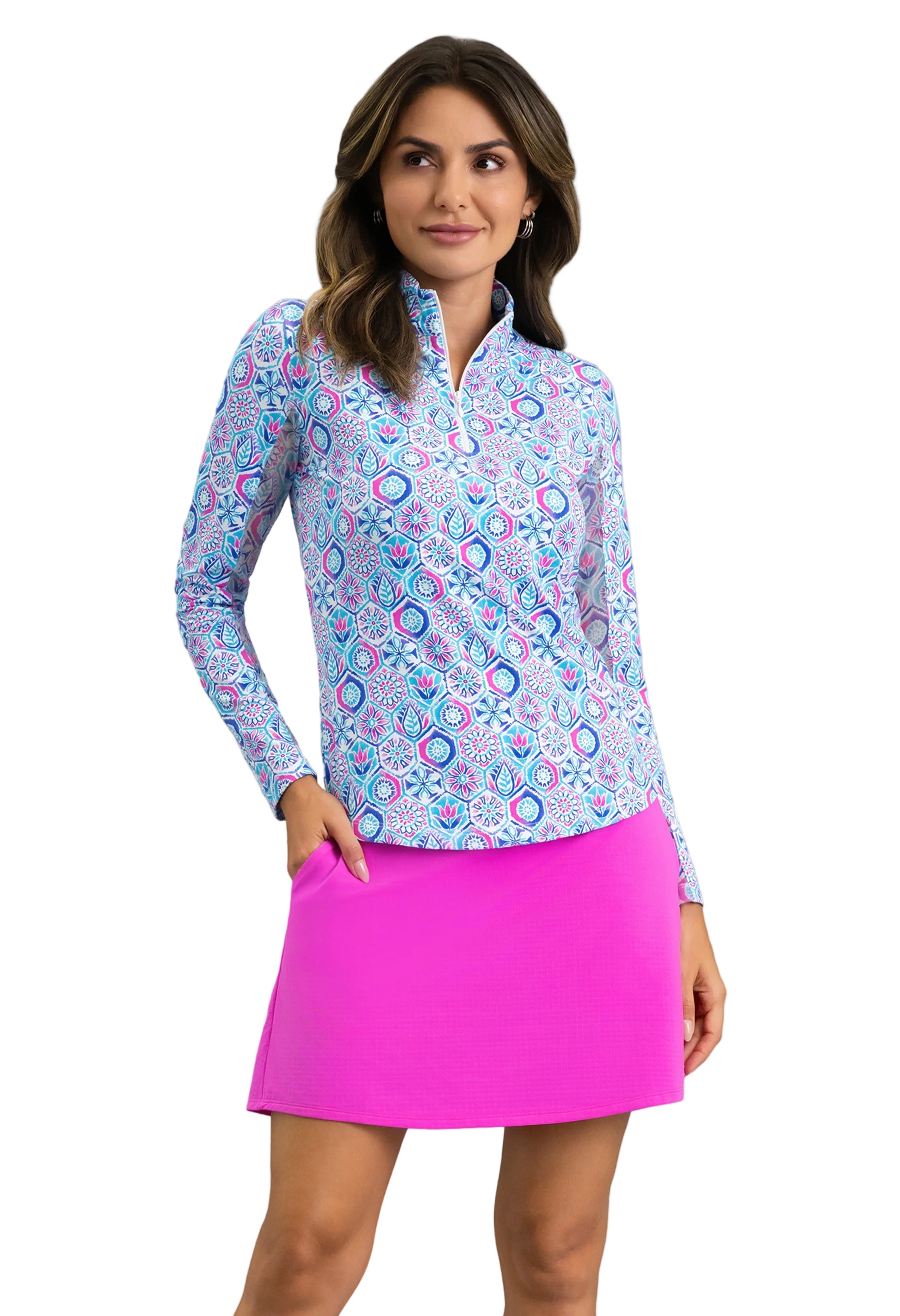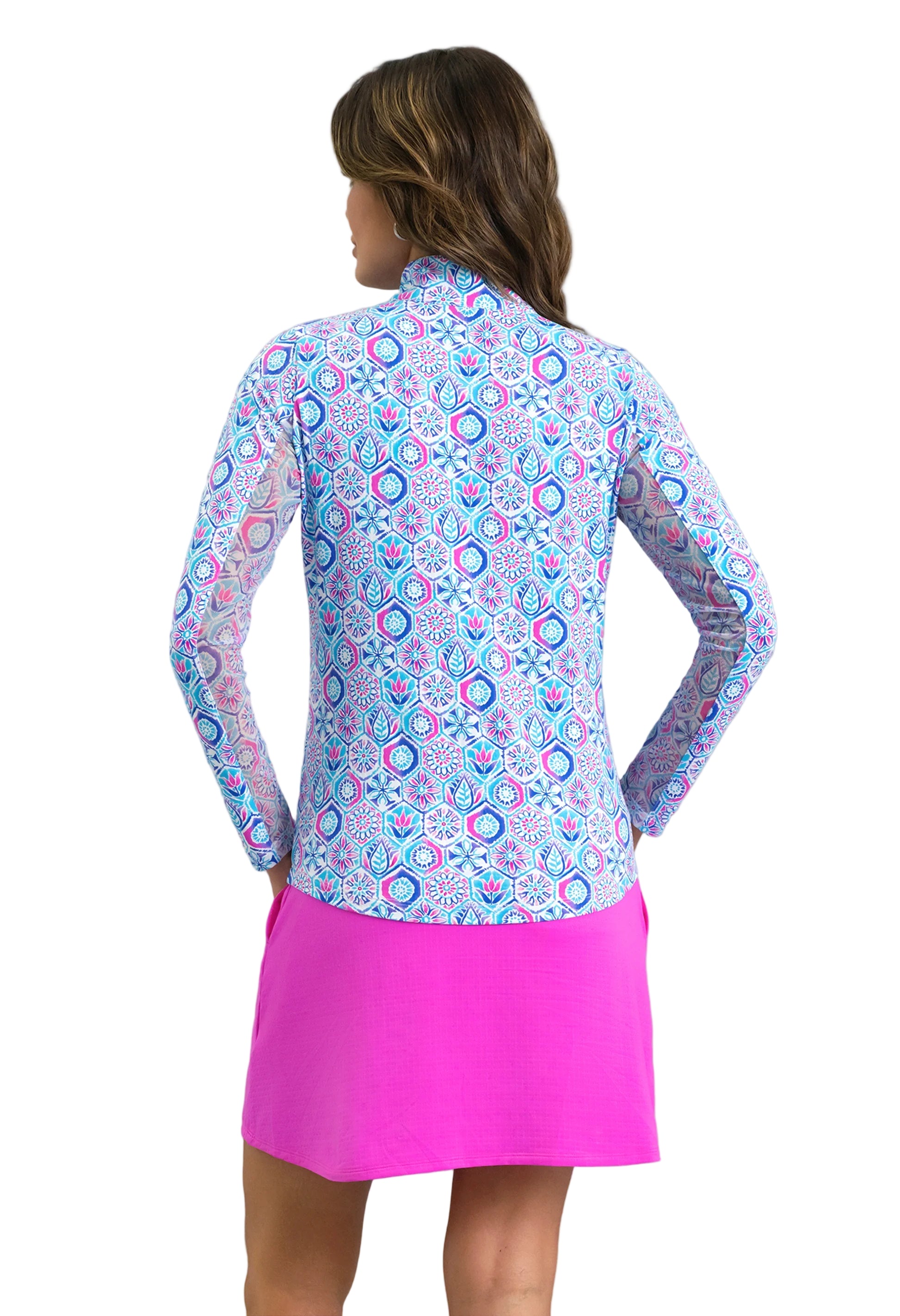 Elevate your golf game with the IBKUL Alexis Long Sleeve Mock Neck Top, where vibrant turquoise mosaic patterns meet performance. Crafted from innovative Iceƒil® fabric, this lightweight wonder keeps you cool and dry while tackling moisture and odor. Strategic underarm mesh panels boost airflow exactly where you need it, and robust UPF 50+ protection shields you from the sun's rays during extended outdoor play. Style meets substance in every stitch.