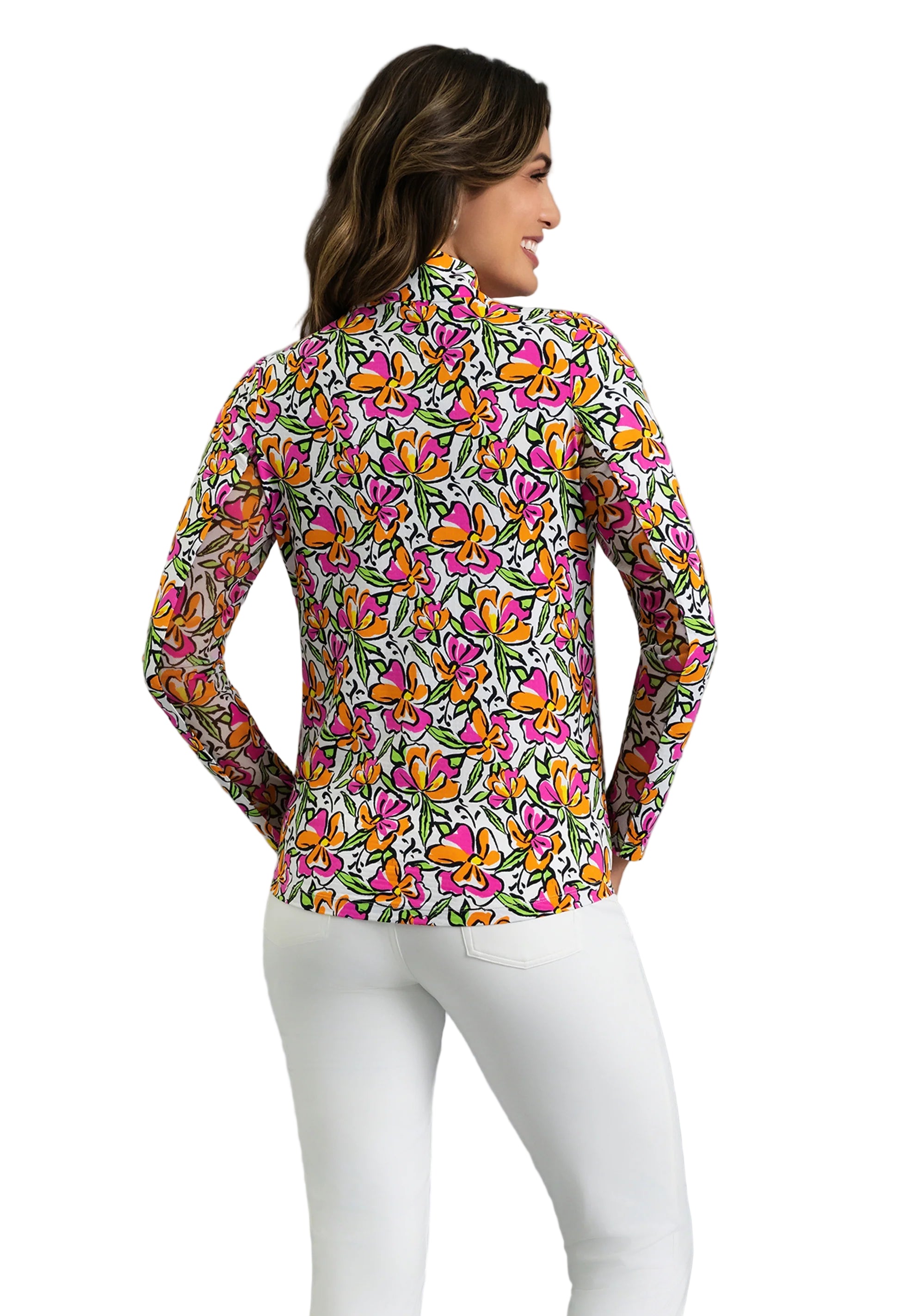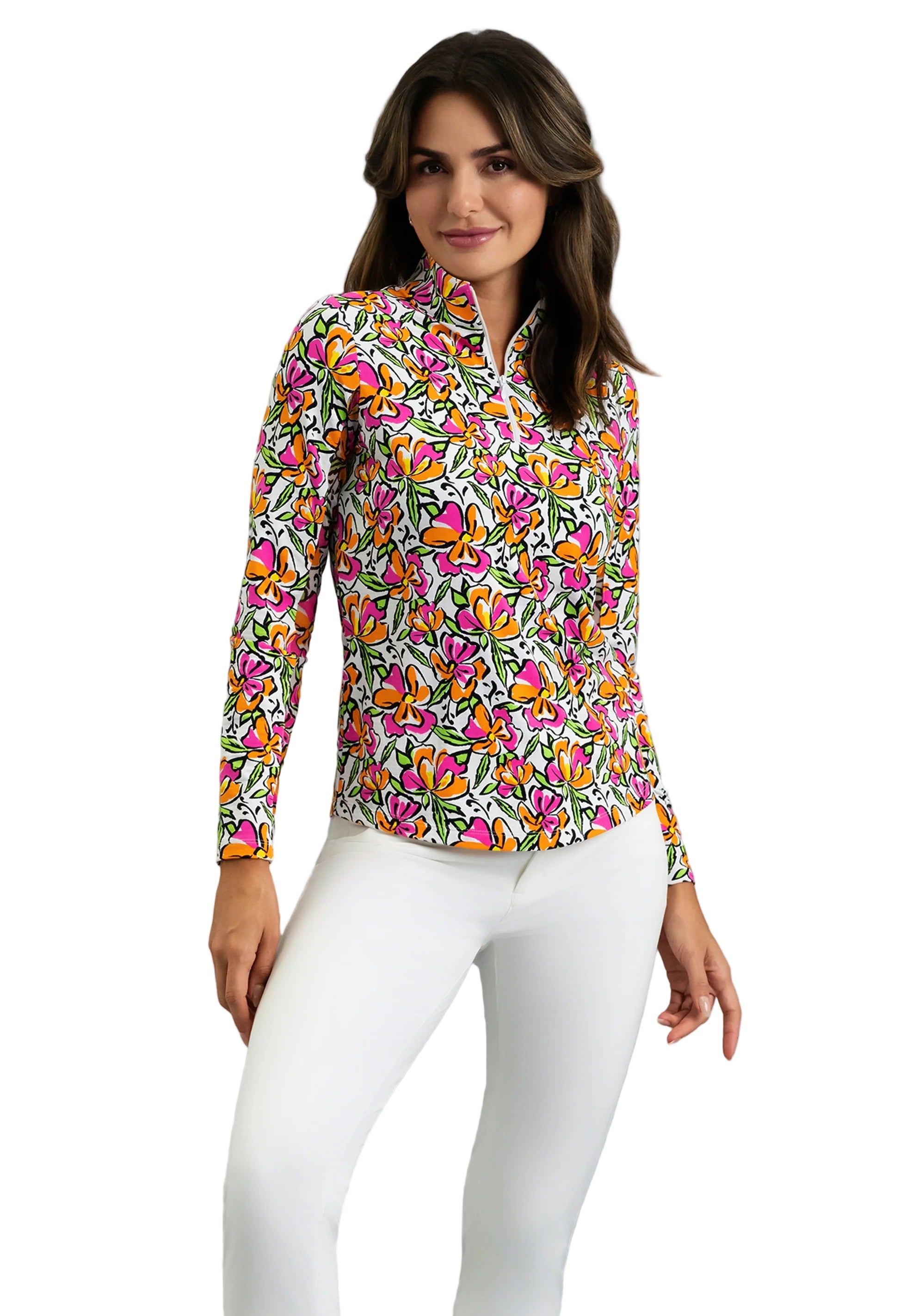 Rock the course in style with this fun IBKUL Sonia top, bursting with tropical hibiscus prints in hot pink and orange peel. The lightweight Iceƒil® fabric keeps you cool, dry, and fresh while mesh underarm panels boost airflow. Plus, UPF 50+ protection shields you from the sun—because looking good shouldn't mean sacrificing comfort..