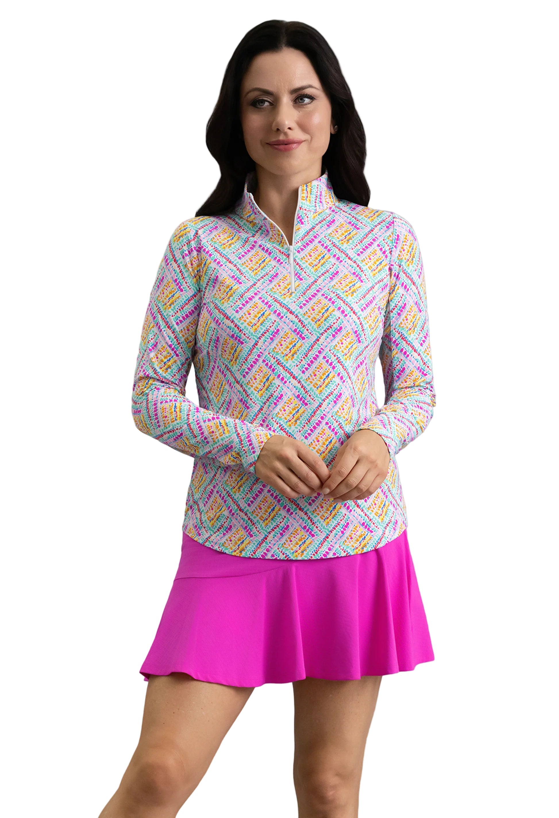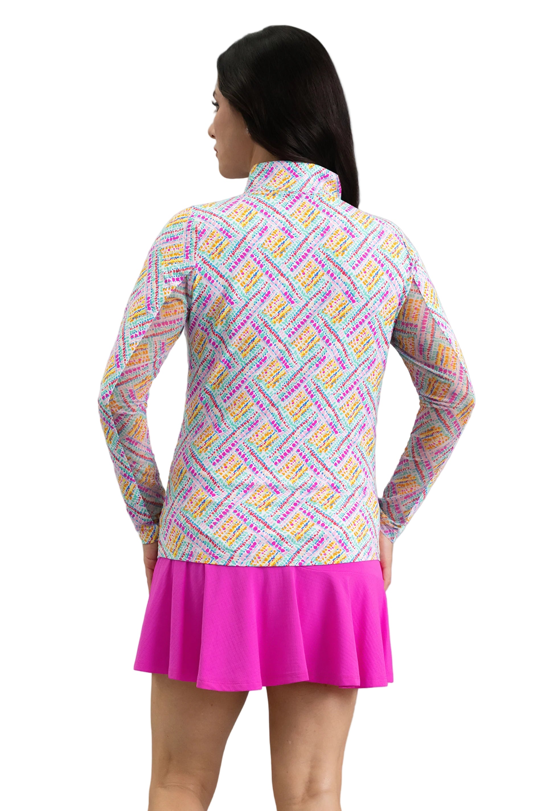 Brighten your game with this vibrant Nina Hot Pink Multi Top from IBKUL. Featuring a fun confetti dot pattern, it combines style with performance. The signature IceFil® fabric keeps you cool and dry while UPF 50+ protects your skin from the sun. Underarm mesh panels add extra breathability for all-day comfort, whether you're on the course or out and about.